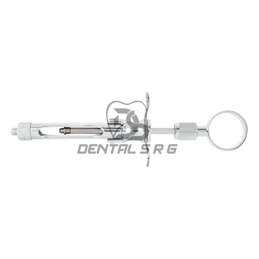An aspirating dental syringe is a tool used by dentists to administer local anesthetics during dental procedures. The syringe is designed to hold a cartridge containing the anesthetic solution and allows for precise delivery into the tissue around the area of treatment.